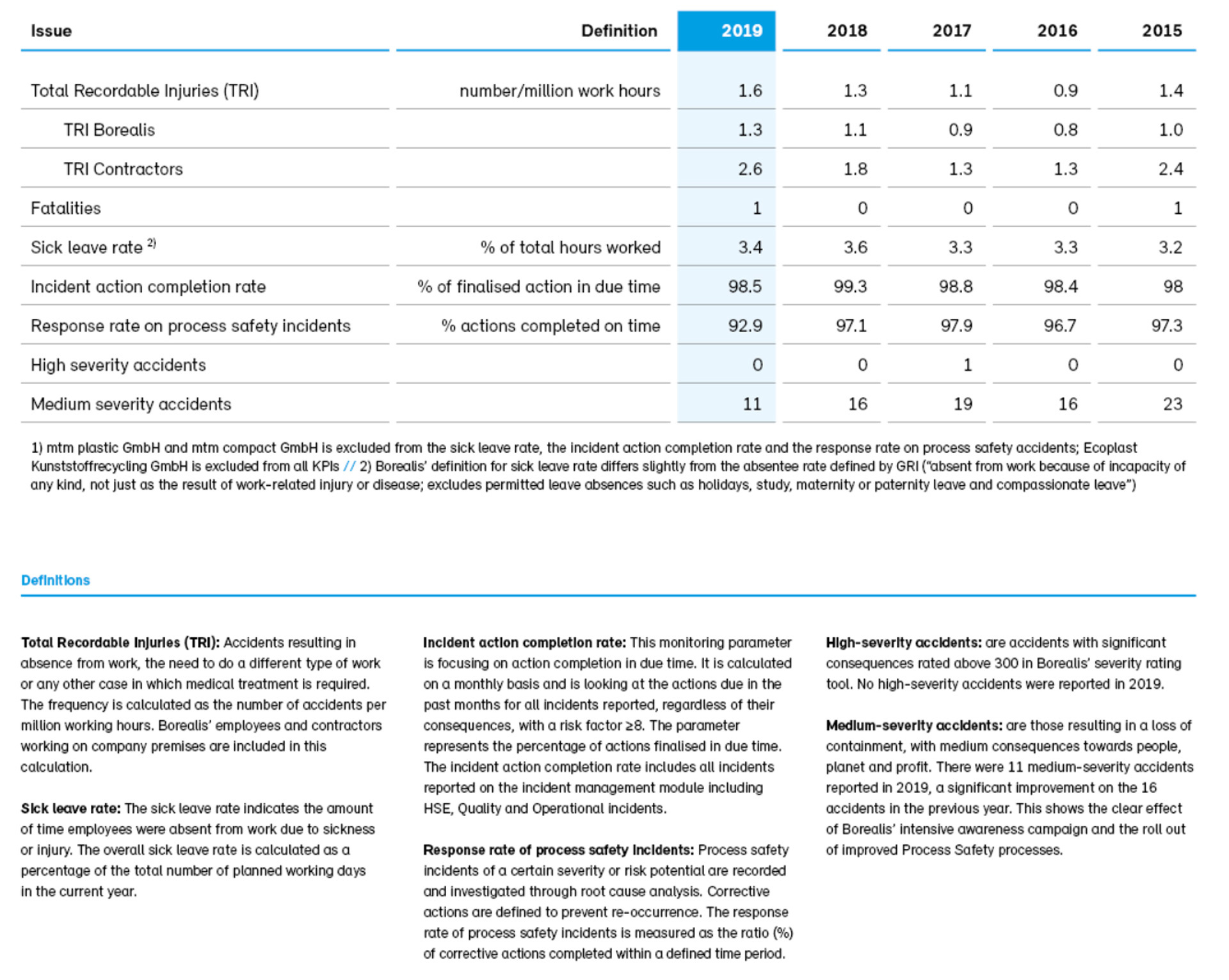 Health & Safety is one of the key sustainability focus areas in Borealis and the number one priority in the organisation. Borealis had the following occupational health and safety goals for 2019: