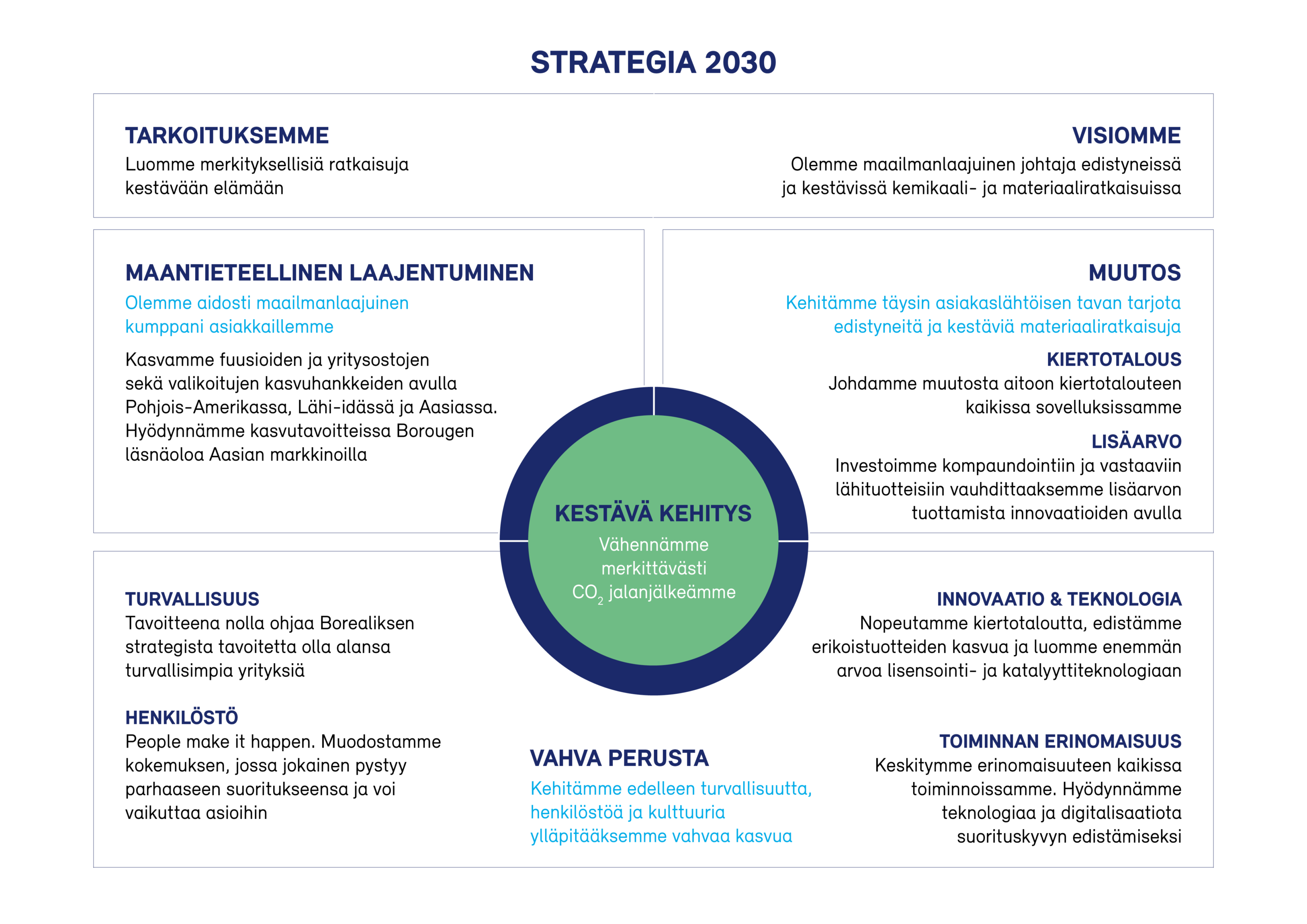 Borealiksen We4Customers(We4C)-strategia asettaa asiakkaat keskiöön. Tavoitteenamme on vakiinnuttaa asemamme erikoistuneena polyolefiiniratkaisujen tarjoajana, joka on omistautunut luomaan arvoa asiakkaillemme. Tarjoamalla heille innovatiivisia ja kestäviä ratkaisuja edistämme omia kestävyyspyrkimyksiämme ja vaikutamme samalla myönteisesti maailmaan. We4C-strategiamme perusta on missiomme: Luomme edelleen ratkaisuja kestävään elämään, jonka tarkoituksen ja hengen koko OMV-konserni jakaa.