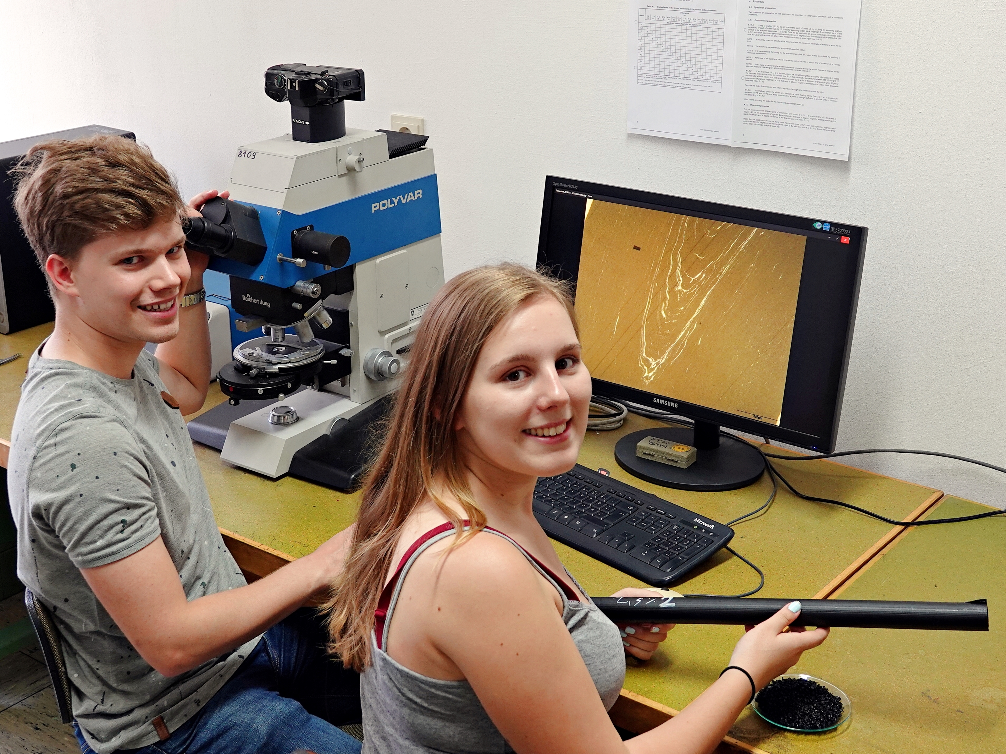 © GFKT. image. 4.31mbFoto: Projektteam bei der mikroskopischen Untersuchung von Rohren (v.l.n.r.: Paul Weiss, Vanessa Pichler), 2. Platz