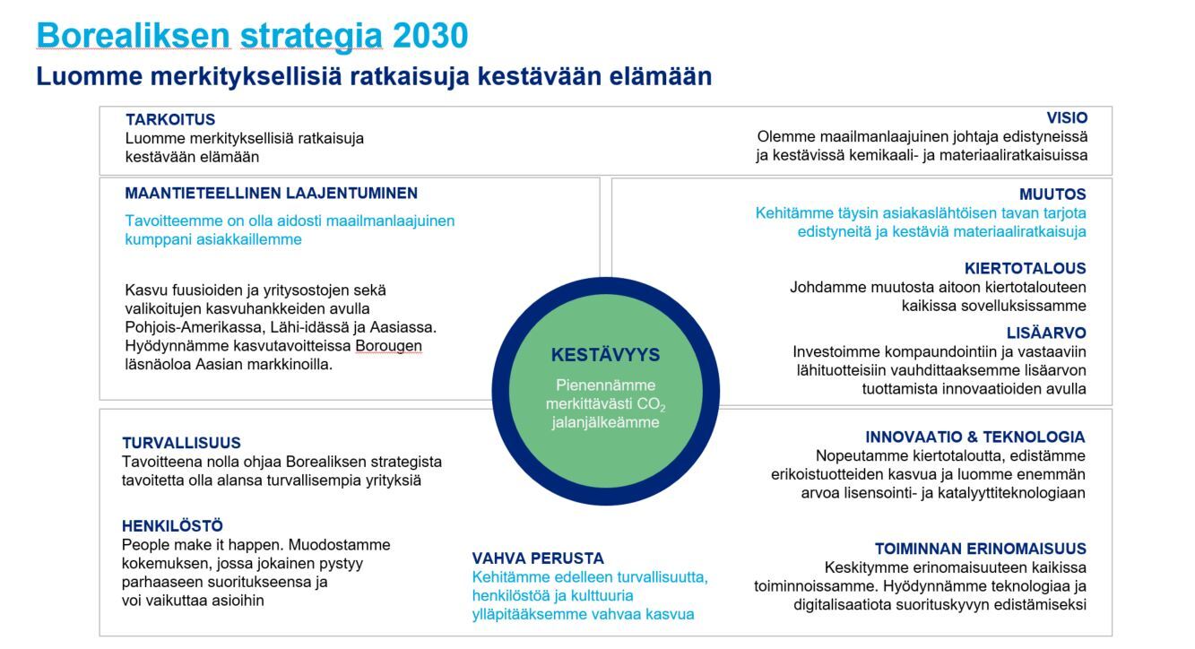 Borealis on julkaissut 2030 strategiansa. Strategian ytimessä on kestävyys, jota tukee Borealiksen vahva sitoutuminen turvallisuuteen, ihmisiin, innovaatioihin ja teknologiaan sekä toiminnan erinomaisuuteen. Nämä tukevat jatkuvaa maantieteellistä laajentumista ja meneillään olevaa muutosta kohti kiertotaloutta. Strategiassa asetetaan uusia ja kunnianhimoisempia kestävän kehityksen tavoitteita liittyen kasvihuonekaasupäästöjen (GHG) vähentämiseen, energiankulutukseen ja kiertotalouteen. Borealiksen 2030 strategian perustana on yhtiön tarkoitus: ”Luomme merkityksellisiä ratkaisuja kestävään elämään”, jonka tavoite ja henki ovat yhteisiä koko OMV-konsernille.