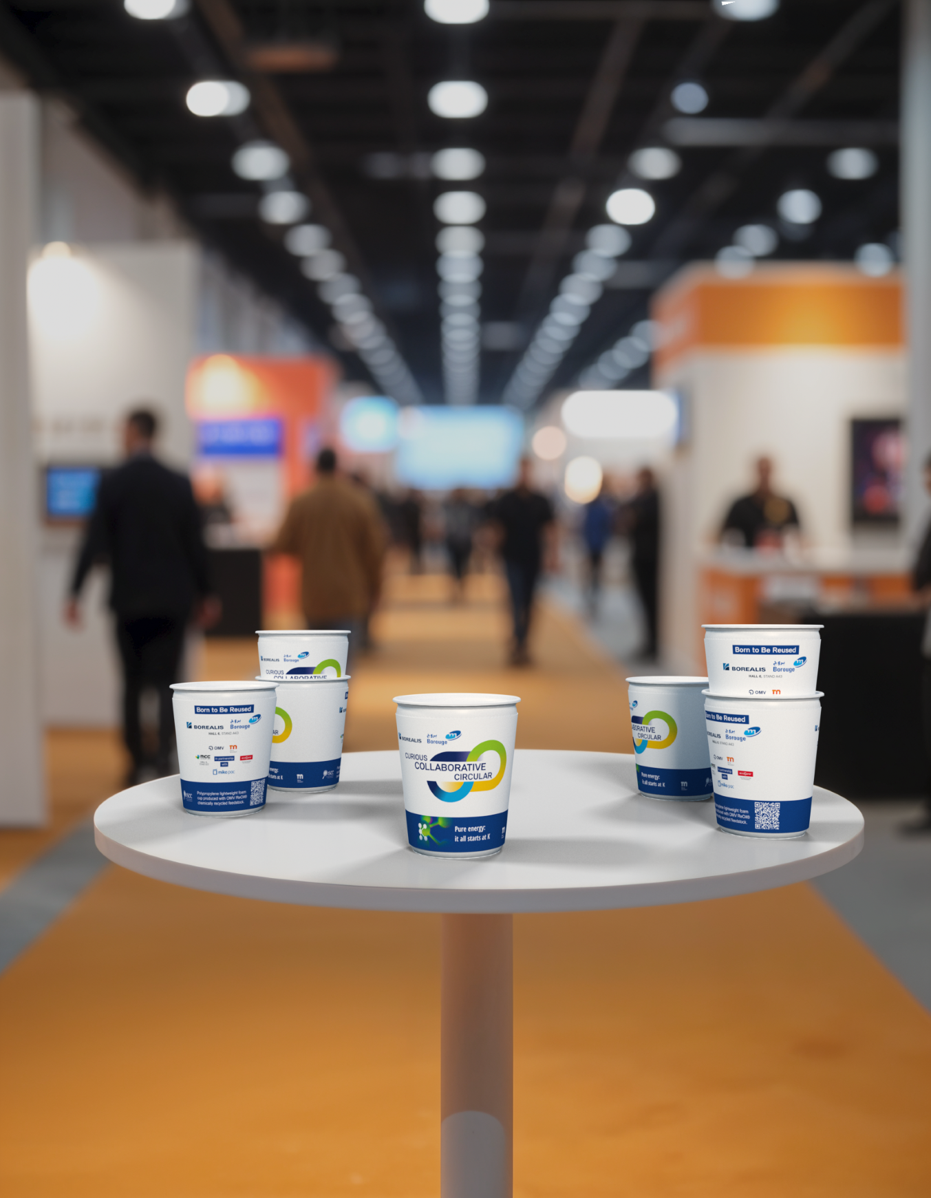 Das Logistikpersonal sorgt dafür, dass auf den Tischen zurückgelassene oder in den Sammelbehältern entsorgte Becher eingesammelt, in den Küchen vor Ort gespült und wieder in den Kreislauf zurückgebracht werden. Alle Becher, die in den allgemeinen Abfallbehältern entsorgt werden, werden nach der Messe eingesammelt und von Borealis recycelt. Nicht benutzte Becher werden zur Weiterverwendung gespendet.