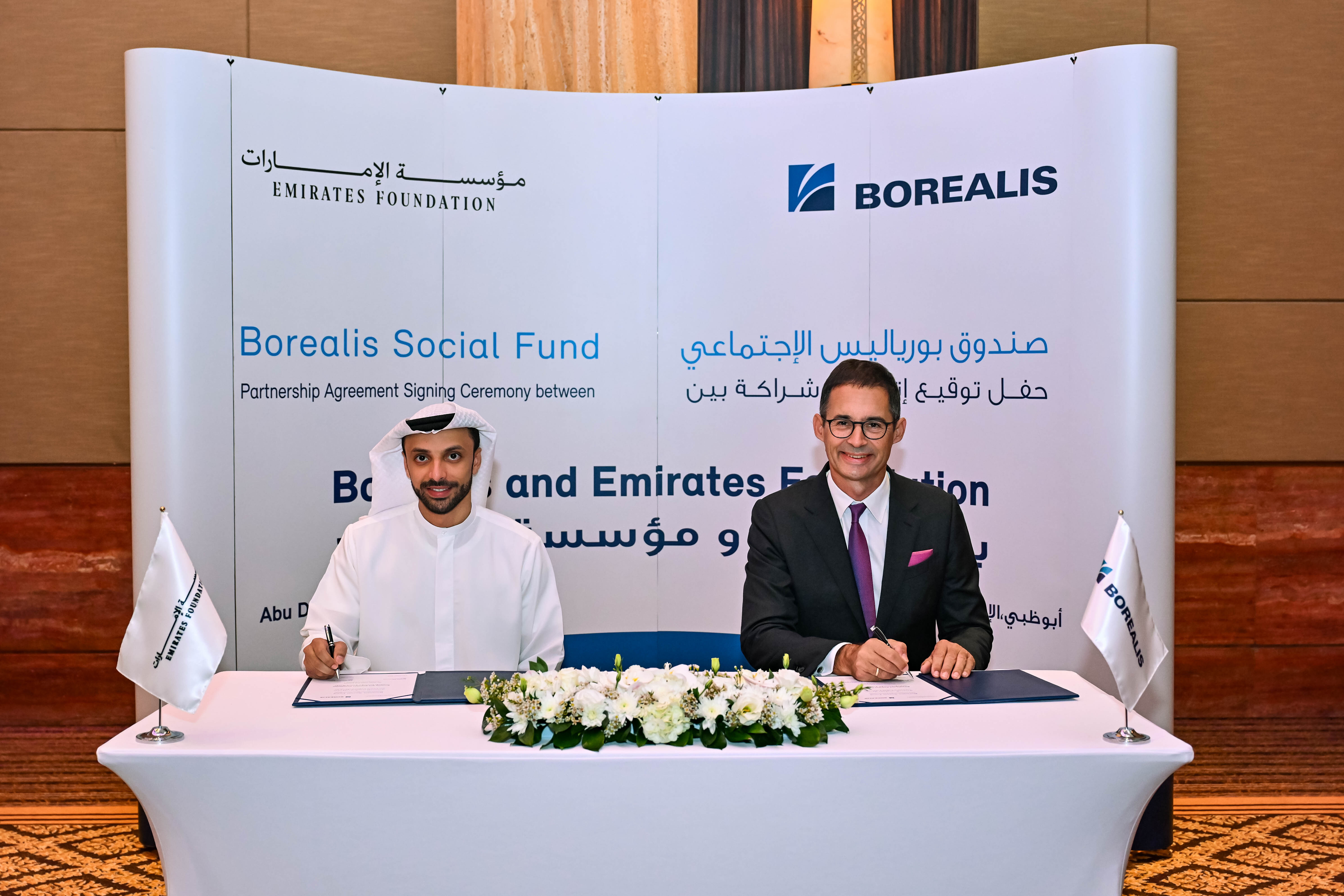 Foto: Unterzeichnung des Partnerschaftsabkommens zwischen Borealis und der Emirates Foundation durch Stefan Doboczky, Borealis CEO, und S.E. Ahmed Al Shamsi, CEO der Emirates Foundation