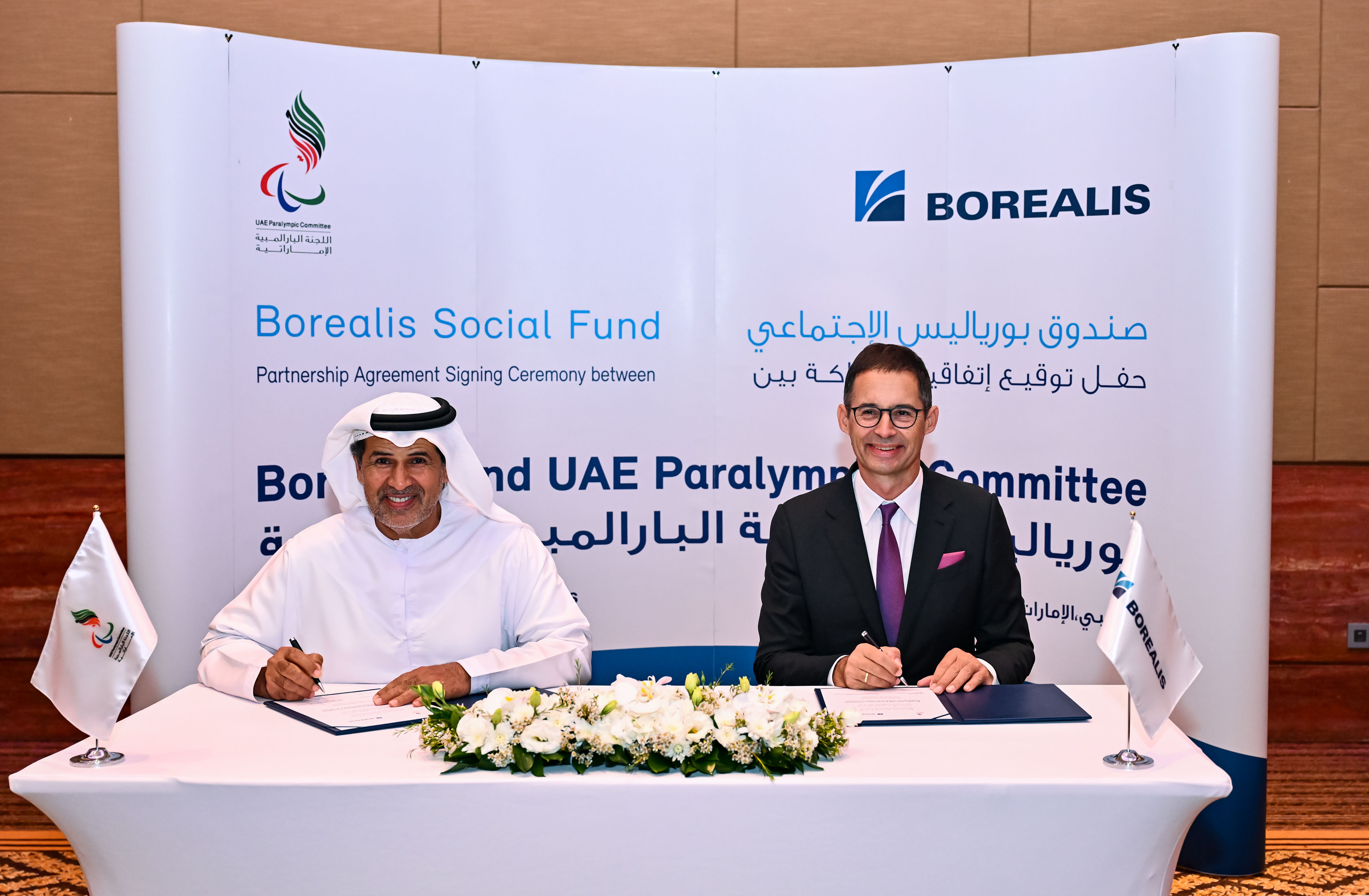 Foto: Unterzeichnung des Partnerschaftsvereinbarung zwischen Borealis und dem Paralympischen Komitee der VAE durch Stefan Doboczky, Borealis CEO, und S.E. Mohammed M. Fadhel Al Hameli, Vorsitzender des paralympischen Komitees der VAE unterzeichnet