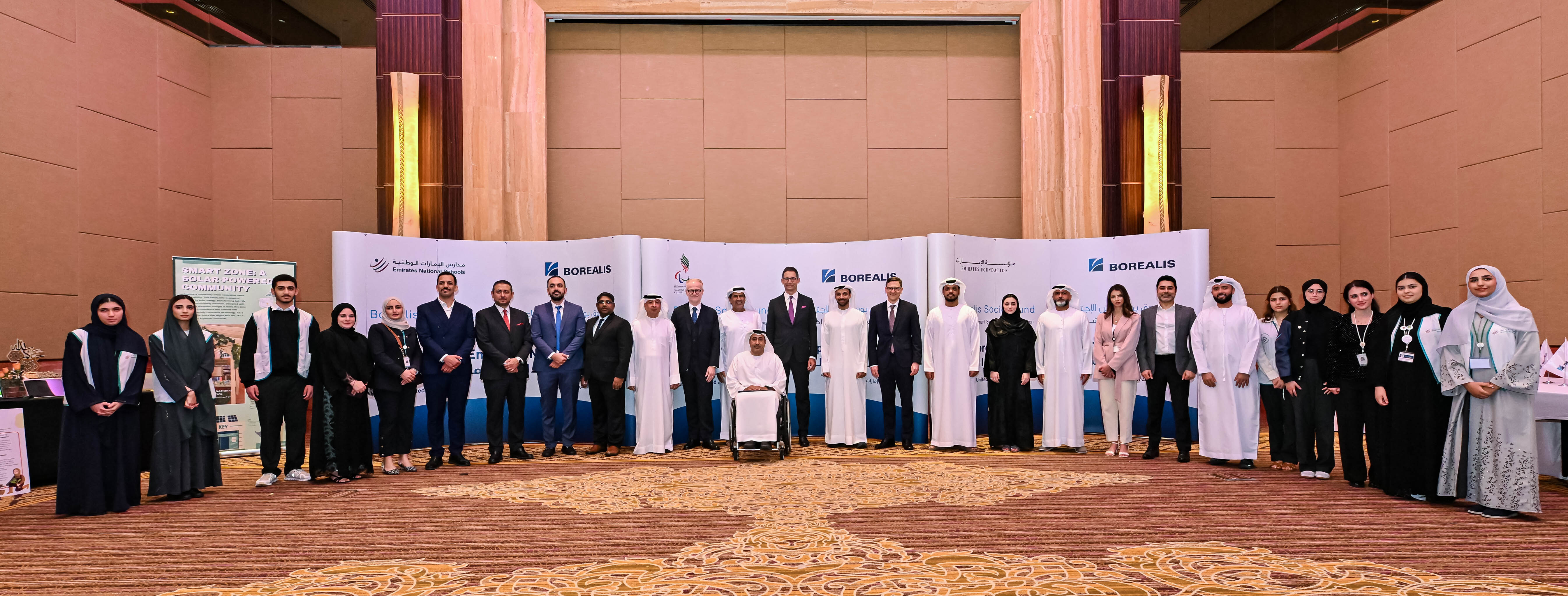 Foto: Stefan Doboczky, Borealis CEO, und Thomas Boesen, VP Middle East, mit Vertretern der drei Partnerorganisationen (Emirates Foundation, Paralympische Komitee der VAE und Emirates National Schools)