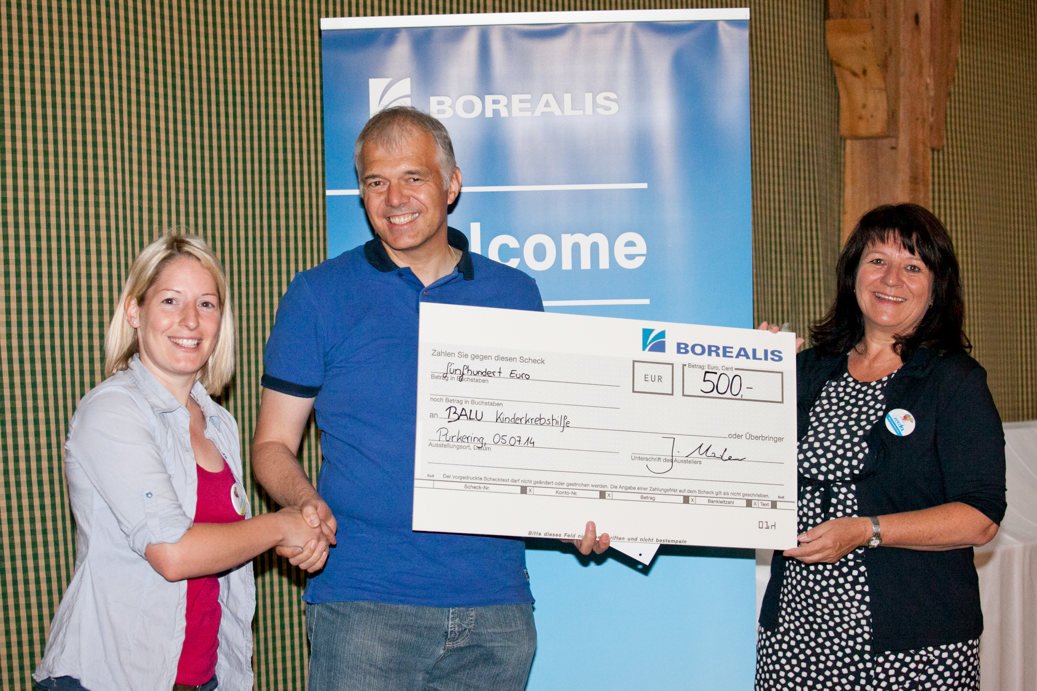 Standortleiter Jürgen Mader nutzte im Rahmen des BALU Sommerfestes auch die Gelegenheit, einen Scheck für BALU an Gerda Winkler zu überreichen. Das Geld wurde im Rahmen der jährlich für Mitarbeiter am Standort Burghausen stattfindenden Gesundheitstage gesammelt. An drei Tagen im Mai, an denen Gesundheits- und Sicherheitsthemen mit diversen Informationsveranstaltungen und Möglichkeiten zur Vorsorge im Vordergrund standen, wurden insgesamt EUR 500 von den Mitarbeitern gesammelt, die nun an BALU übergeben wurden. „Wir freuen uns, dass Borealis uns nun schon seit einigen Jahren sowohl finanziell als auch durch persönliches Engagement der Mitarbeiter unterstützt," sagt Gerda Winkler.