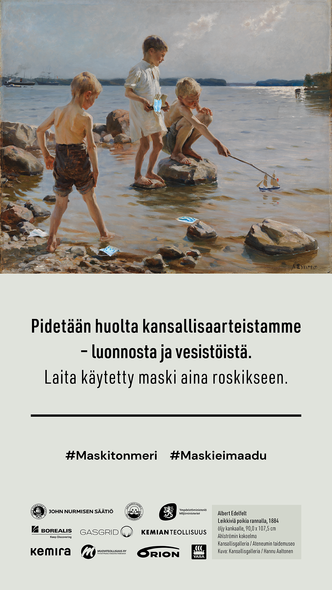 Kesä on ulkona olon aikaa ja Maskiton meri -kampanjassa mukana olevat organisaatiot toivovatkin kaikkien pystyvän nauttimaan Suomen luonnosta ilman roskia. Huolehdithan sinäkin siis, että kertakäyttömaskisi päätyvät käytön jälkeen energia-, seka- tai polttokelpoiseen jätteeseen.