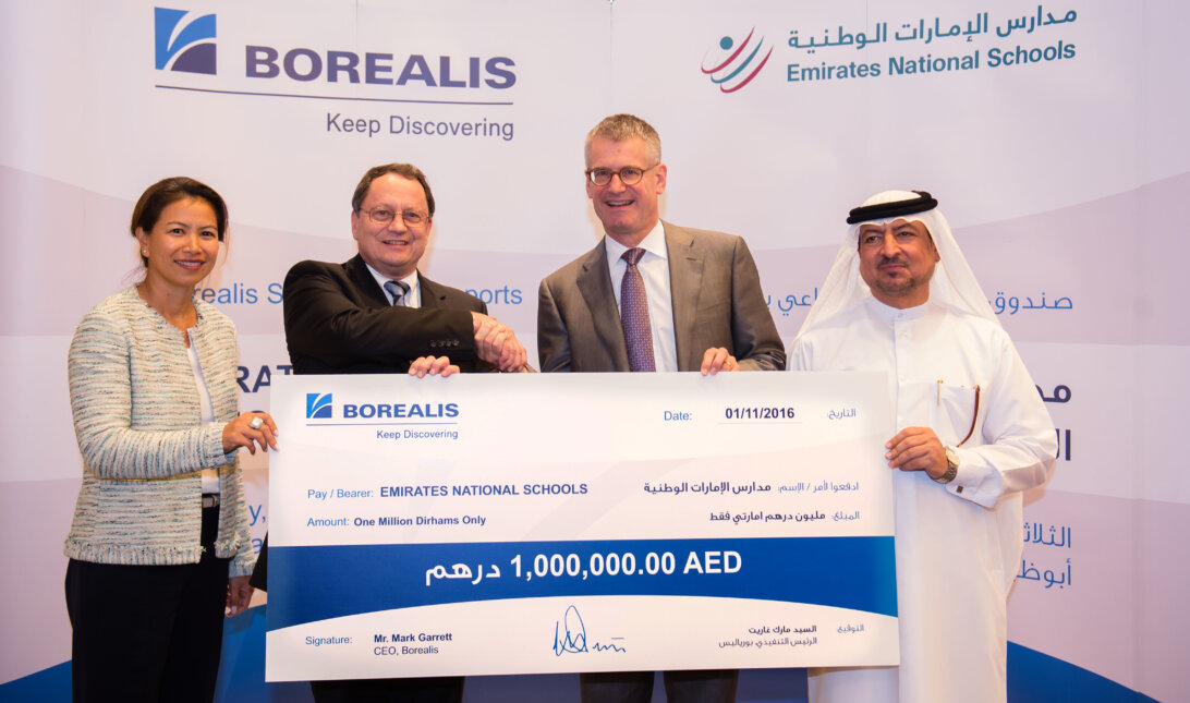 AED 1 million each has been presented to the Emirates Foundation of Youth Development, the UAE Disabled Sports Federation, and the Emirates National Schools. Borealis Chief Executive Mark Garrett handed over cheques to the three organisations representatives at a ceremony held in Abu Dhabi on 1 November 2016.