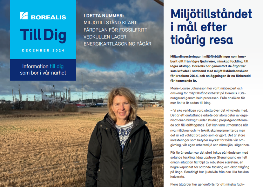 I dagarna fick vi verksamhetsvillkoren för vårt miljötillstånd för vår krackerverksamhet i Stenungsund. Flera stora projekt, investeringar och utvecklingsarbeten har gjorts från det att miljötillståndet utfärdades 2014 och tills nu, tio år senare, då de slutgiltiga villkoren fastställts. Om detta, den pågående energikartläggningen, vårt nya lager på Vedkullen och om kemi-, plast- och läkemedelsindustrins färdplan mot fossilfri kemi, kan du läsa i det nya numret av vårt lokala nyhetsbrev som du hittar här nedanför.