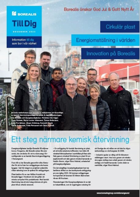 På torsdag och fredag delas vårt lokala nyhetsbrev Till dig ut i Stenungsund med omnejd. Här kan du läsa om några av de projekt som pågår på anläggningen i Stenungsund, till exempel om studien kring en Kemisk återvinningsanläggning som nu går in i nästa steg, och hur vi arbetar för att skapa en cirkulär ekonomi kring plast.