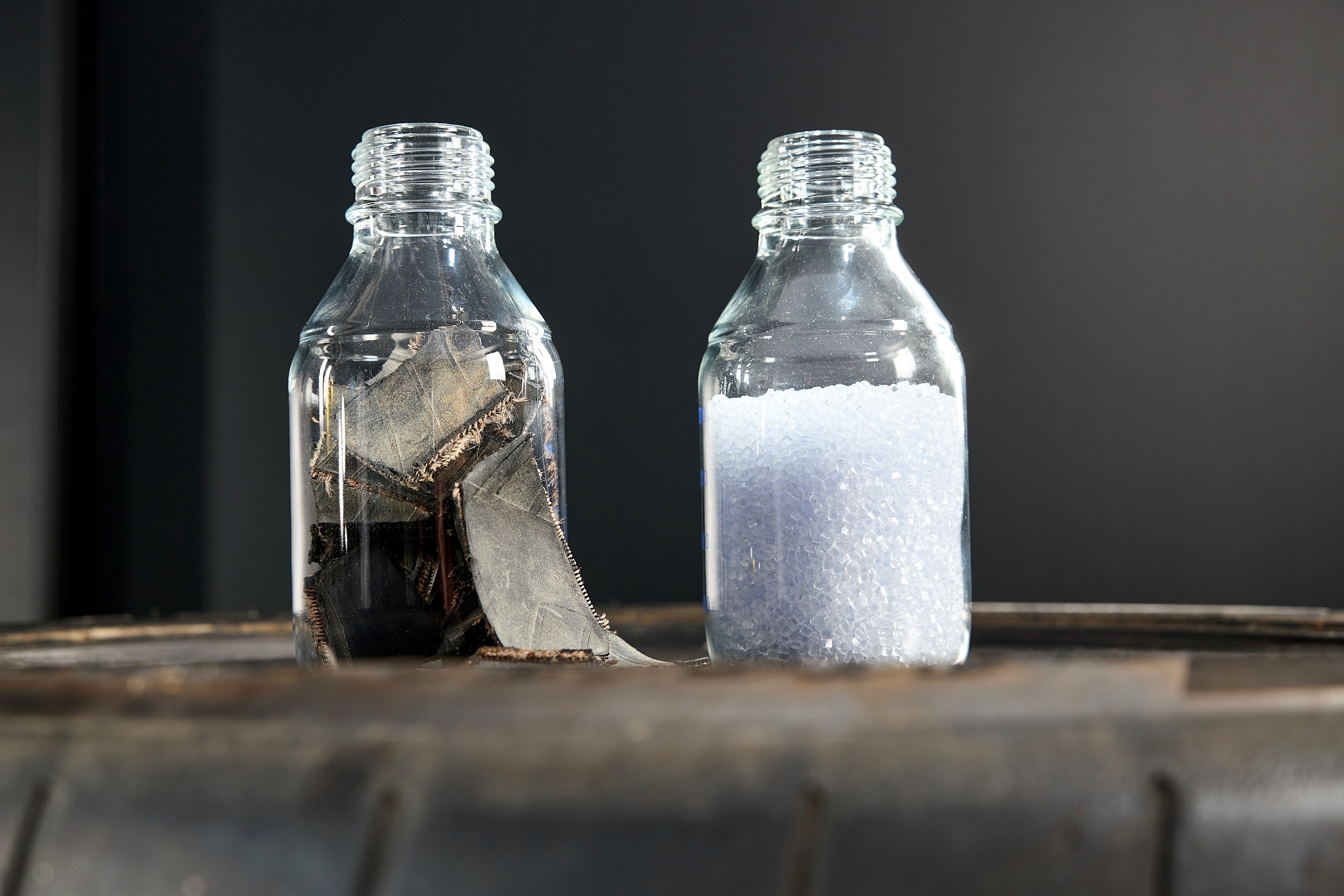 Kuva: Yhteistyötä kiertotalouden edistämiseksi. Vasemmalta oikealle: Jeroen Verhoeven (Neste), Thomas Van De Velde (Borealis), Guido Naberfeld (Covestro) tähtäävät uusien autonosien valmistamiseen käytöstä poistetuista renkaista.