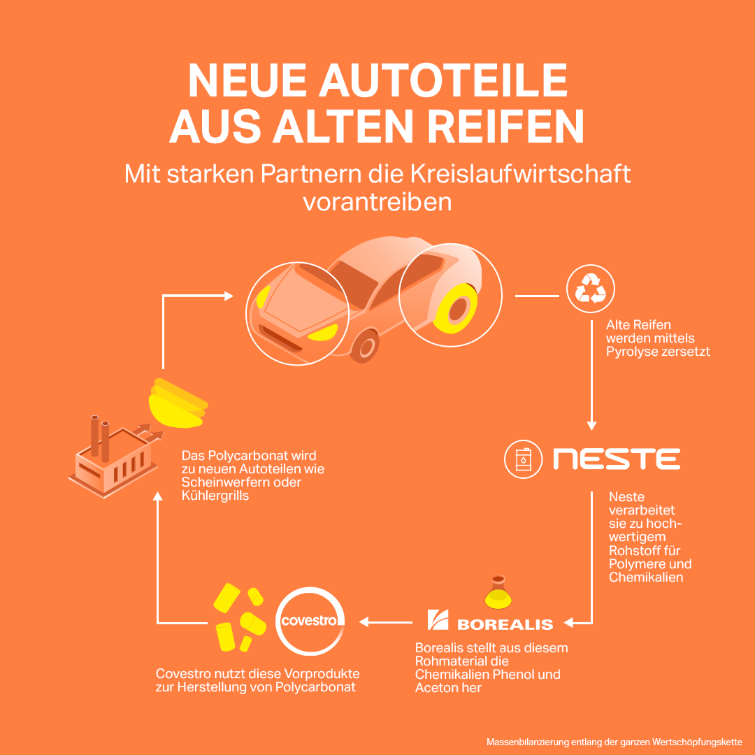Im Rahmen der Zusammenarbeit verarbeitet Neste verflüssigte Altreifen zu einem hochwertigen Rohstoff für die Herstellung von Polymeren und Chemikalien und liefert diesen an Borealis. Borealis verarbeitet den von Neste produzierten Rohstoff zu den Basischemikalien Phenol und Aceton. Covestro wiederum verwendet diese Stoffe zur Herstellung von Polycarbonaten. Der Anteil der recycelten Inhaltsstoffe wird über die Massenbilanzierung nach ISCC Plus bis zu den Endprodukten zugeordnet.